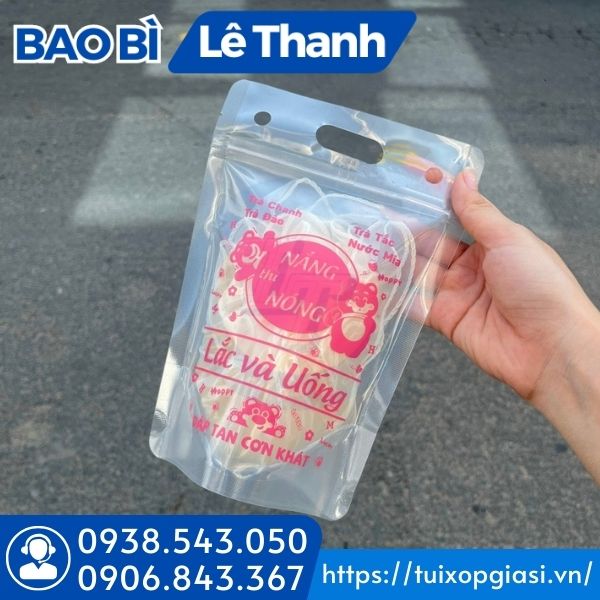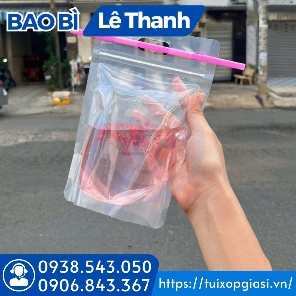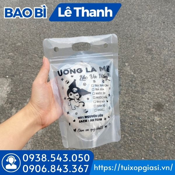 Bề mặt trong suốt in hình, thông tin sẵn. Ngoài ra trên phần miệng túi còn được thiết kế 2 bên 2 lỗ nhỏ để gác ống hút rất tiện lợi